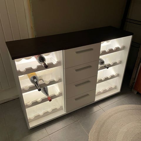 Viinikaappi lasiovella, valaistuksella ja viidellä puuhyllyllä viinipullojen säilytykseen vaakatasossa. Kaapissa on digitaalinen kaksialueinen lämpötilanäyttö. Myydään tarpeettomana.