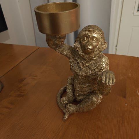Kultainen apinakoriste. Ollut tosiaan vaan koristeena eikä ole mitään osumia ottanut. Korkeutta hänellä häntineen on 38 cm.