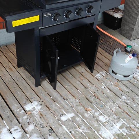 Likainen talven jäljiltä, siivotaan ennen omistajan vaihtumista. Toinen grillin sivu myös tallella vaikka ei näy kuvassa.