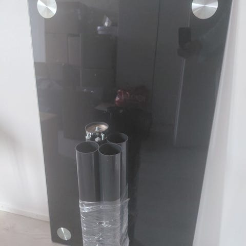 Lasitasollinen ja metalliputkirunkoinen ruokailupöytä, runko kevyt. Lasitaso käännettävissä, toinen puoli mattapintainen, toinen kirkkaampi. Moitteettomassa kunnossa.