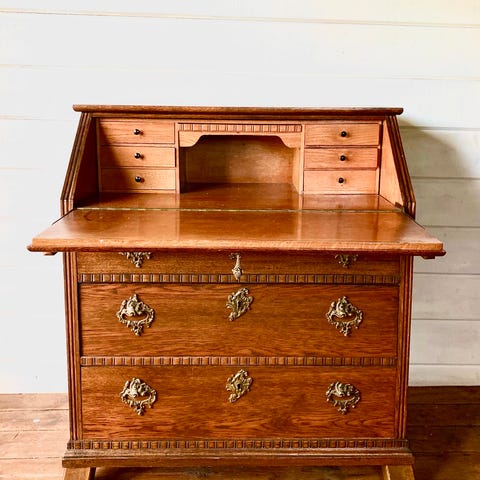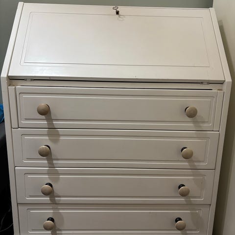 Koivuinen vintage klaffilipasto kahdella lukittavalla laatikolla ja lukittavalla ylätasolla. Peili yläosan hyllyjen takana. Löytyy ajan patinaa ja paljon säilytystilaa.
