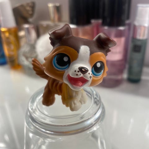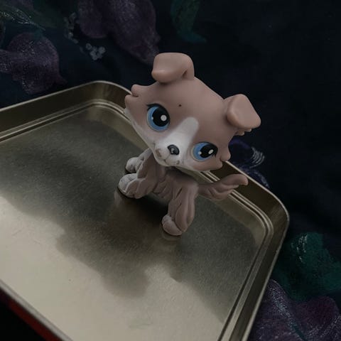 Littlest Pet Shop koirafiguuri. Pääväri on violetti ja kuonossa sekä tassuissa on valkoisia ja vaaleanruskeita yksityiskohtia. Sopii lasten leikkeihin ja kokoelmiin. 💜