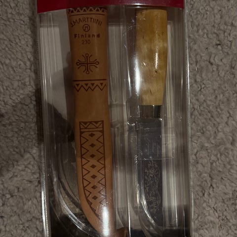 Perinteinen puukko, jossa puinen kahva ja teräksinen terä. Mukana muotoiltu nahkatuppi, jossa vyölenkki kuljettamista varten. Soveltuu yleiskäyttöön esimerkiksi retkeilyyn, askarteluun tai pihatöihin. puukko on todella pieni kokoinen ja kahvaosasta on lakkaa vähän kulunut.