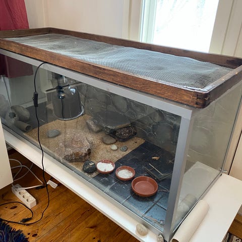 Lasinen terraario 75cm leveä, 40cm syvä ja 40cm korkea. Avoin yläosa, tasanteet löytyy joten tarvittaessa levyn saa siihen päälle. Lasipinnoissa on teipin jälkiä jotka eivät vaikuta peruskäyttöön. Pohjan alla paperia joka repeytynyt, sen voi ottaa kokonaan pois.