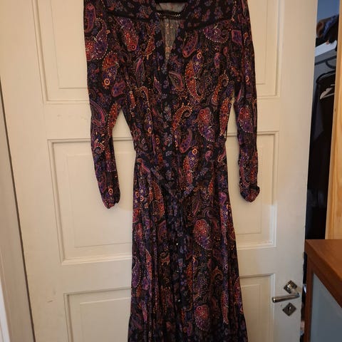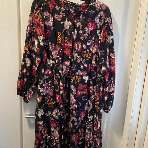 Kaunis uusi kukkamekko. 83% viskoosi, 17% polyamidi. Vuori 100% polyesteri. Luonnonvalkoinen punaruskeilla kukilla.