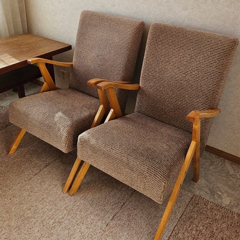 Kaksi vanhaa nojatuolia. Hyvässä kunnossa. Takana pyörät. Korkeus 67,5cm ja leveys 82,5cm.