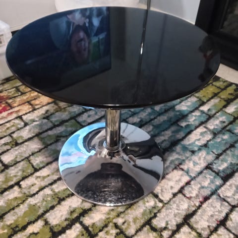 Kolmijalkainen pöytä, jossa on epäsäännöllisen muotoinen lasikansi. Pöydän jalat ovat metallia ja lasikansi on kiinnitetty metallisilla tuilla.