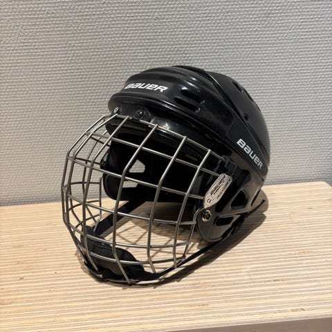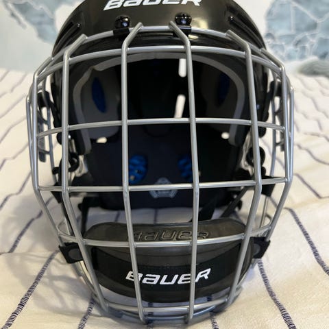 Bauer 7500 jääkiekkokypärä, koko M. Kypärässä säädettävä kuori ja pehmustettu sisäosa, jossa siniset yksityiskohdat. Mallimerkintä BHH7500M