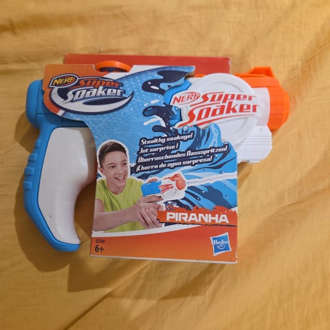 Nerf Super Soaker H2Ops Squall Surge vesisuihkuase. Painejärjestelmällä toimiva vesipyssy, jossa sinivalkoinen runko ja oranssit yksityiskohdat. Soveltuu ulkoleikkeihin veden kanssa. Käyttö vain puhtaan veden kanssa valmistajan ohjeiden mukaan.