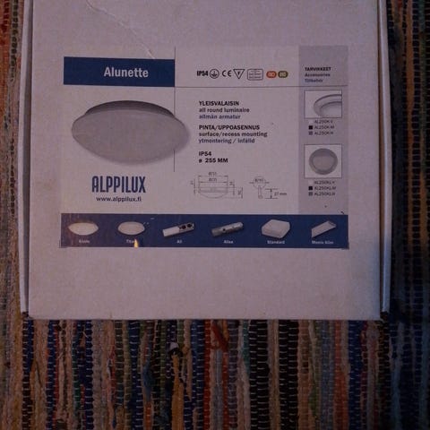 Alppitukku AT9329PV plafond for bathroom, IP44, ∅ 23 cm, 2x9 W lamps (G23 bi-pin base, less than 16 cm space). ∅ 23 cm. Attached with a base through two screws 8 cm apart. (This is a standard size.)