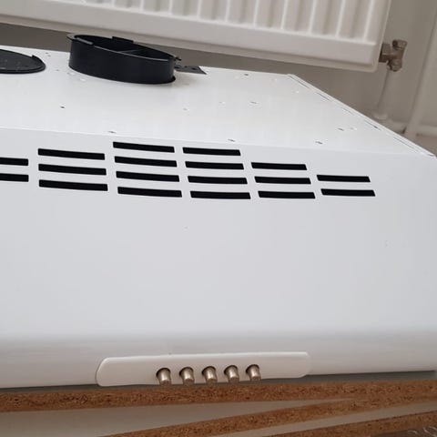 Vanerista tehty kulmamallin huuva ja siihen sopiva liesituuletin. Tuuletin merkiltään Silence Tech Electrolux. Tuulettimessa kolme nopeutta ja valo. Huuva vaatii maalauksen tai muun pinnotuksen.