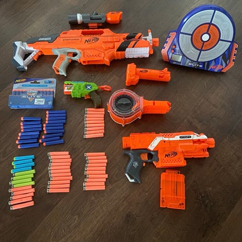 Nerf AccuStrike ja Elite vaahtomuovinuolet. Pakkauksissa oranssi-sinisiä Nerf-ammuksia käytettäväksi yhteensopivien Nerf-lelupyssyjen kanssa. Sopivat lisäammuksiksi tai vanhojen nuolten korvaamiseen Nerf-peleissä.