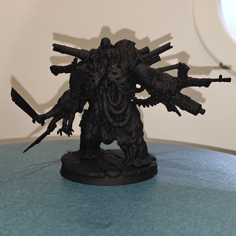 Hahmo on 3D tulostettu ja tulee pohjamaalattuna ja basen kera valmiiksi kasattuna.
