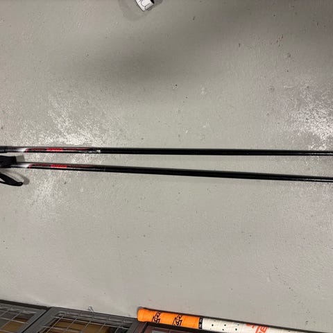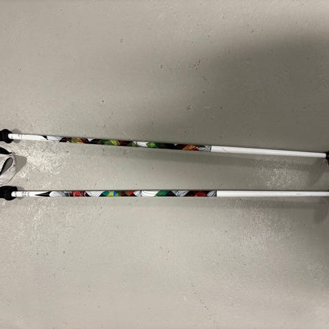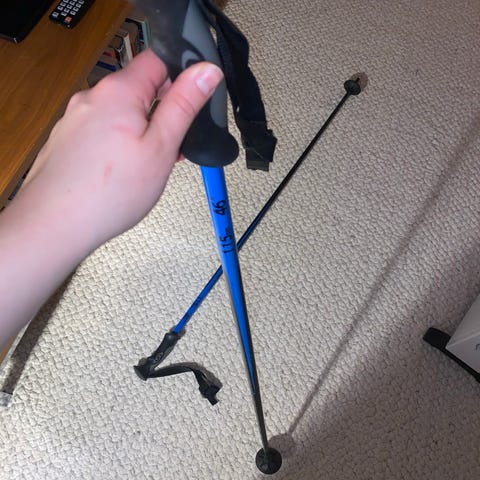 Annetaan hiihtosauvat kuten kuvasta näkyy.. käden lenkit repsottaa mutta ovat ehjät. Sauvojen piikit ehjät mutta muovista lohjennut palanen. Molemmat puutteet näkyy kuvissa. Muutoin vielä käyttökelpoiset.
