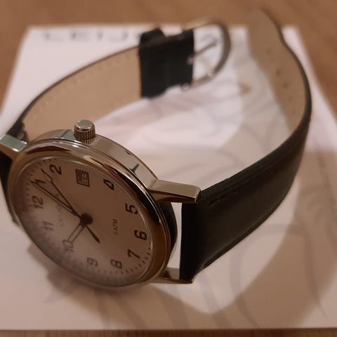 Leijona miesten rannekello kultaisella metallirannekkeella ja mustalla kellotaululla. Kellossa on analoginen näyttö selkein indeksimerkinnöin sekä päivämääränäyttö. Kuori on metallia ja takakansi ruostumatonta terästä. Ranneke on linkkiranneke taittolukolla. Patterit vaihdettava.