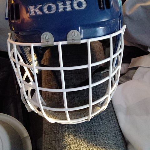 Bauer jääkiekkokypärä ristikolla. Kypärä on valkoinen ja siinä on metallinen kasvosuoja. Säädettävät hihnat ja kiinnikkeet mahdollistavat istuvuuden säätämisen. Soveltuu jääkiekon pelaamiseen ja muuhun jääurheiluun, jossa tarvitaan pään ja kasvojen suojaa. Vsnha, mutta ehjä ja siisti. Ainoastaan yksi verkon kiinikemuovi on kadonnut matkalla. Uusia saa varmasti ostettua ja voi käyttää luistelussa ilmankin. Koko säädettävissä ja on noin 50-55cm