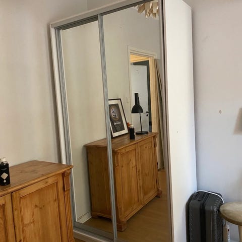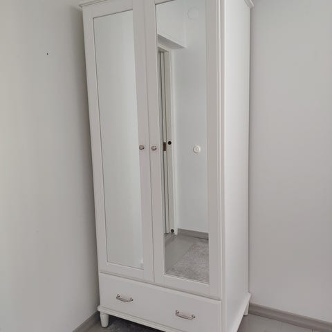 Kaapissa on paikka vaatteille henkareilla ja peilioven takana muutama taso vaatteille. Kaapeissa pientä käytönjälkeä!