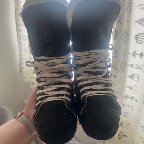 Bauer Vapor jääkiekkoluistimet, koko 42. Väri pääosin musta, yksityiskohtina valkoista ja punaista. Nauhakiinnitys, valkoiset teräpitimet ja teräsrungot. Sisäosa pehmustettu punaisella vuorilla ja valkoisella karvareunuksella. Sopivat jääkiekkoon ja yleiseen luisteluun.