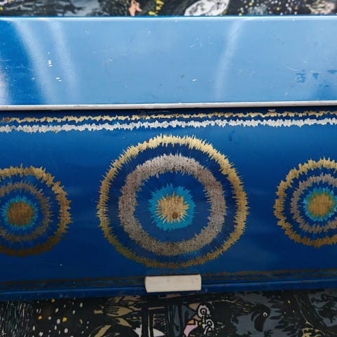 Myyntiin erikoisuus, jollaista ei taatusti tule vastaan. Olen itse koonnut puiseen vetolaatikkoon displayn, jossa vanhoja leivosvuokia sekä pursotin päineen ja pakkauksineen. Kaikki on siististi siimalla kiinni, joten ne on myös irrotettavissa niin, että se ei vaikuta esineen kuntoon. Esineet on kiinnitetty kartonkialustaan, jonka päällä on vanua ja kaunis puuvillakangas (kartonki on liimattu laatikon pohjaan) sekä pitsiyksityiskohta. Ripustus seinälle onnistuu yhdellä naulalla, takana on rautalanka sitä varten. Korkeus 47cm (plus vetonuppi), leveys 29cm ja syvyys 11cm.