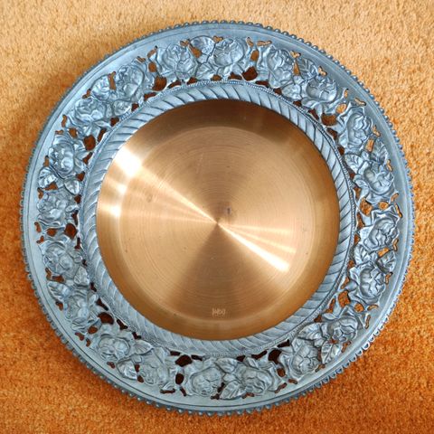 Hopeoidut vaasi, tuhkakuppi, rasia ja tarjoiluastia. Käytössä olleet ja tummentuneet jonkin verran.