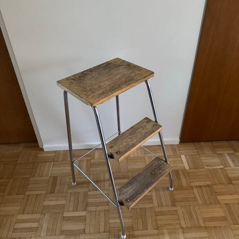 Vanha metallinen porrasjakkara, joka joskus uudelleen maalattu, ehkä useampaan kertaan.