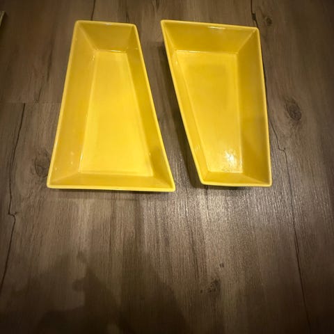 Yksi isompi ja kaksi pienempää monikäyttöistä astiaa, asettuvat neliöksi. Pituus 28 cm ja 17 cm/ pisin sivu. Nouto Jätkäsaaresta.