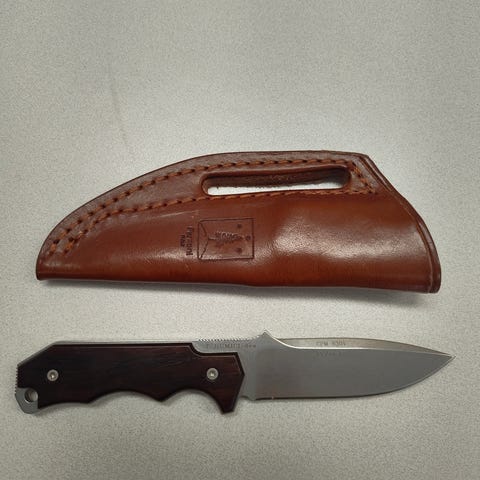 Micarta kahvainen tanto veitsi kivipestyllä CPM 3V terällä. Ovh. 385€.