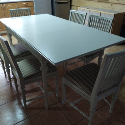 Kustavilainen ruokailuryhmä, jossa kahdella jatkopalalla (44cm per jatkopala) jatkettava pöytä ja 8 tuolia. Lyhyimmillään pöydän pituus on 143,5cm, kuvissa näkyvällä yhdellä jatkopalalla 187,5cm ja molemmilla jatkopaloilla 231,5cm. Pöydän syvyys 89,5 ja korkeus 74,5cm.