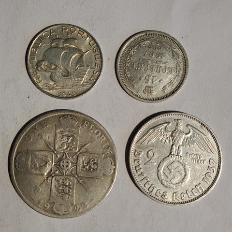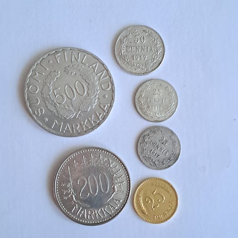 1 Markka 1907 hopea , 50 penniä 1916 hopea , 25 penniä 1908 hopea ja 25 penniä 1917 hopea. kaikki ovat hienokuntoisia. Yhteishinta kaikille 26 € hinta sisältää postituksen. Maksu tilisiirtona.