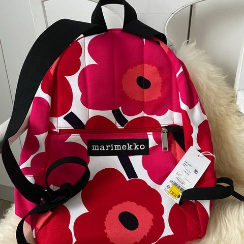 Marimekko kangasreppu unisex. Vaalea kangasmateriaali, edessä iso painettu m-kirjain ja marimekko-teksti. Reppu suljetaan ylhäältä vetoketjulla. Alkuperäinen hinta on 230€