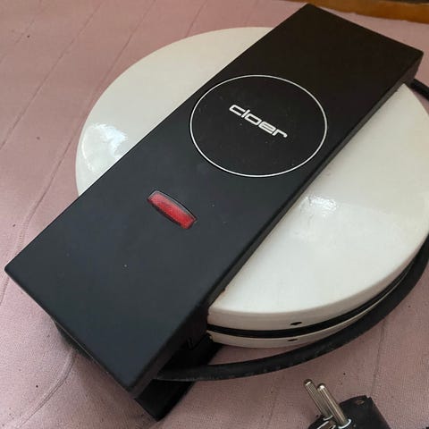 Ariete Party Time vohvelirauta. Pöytämallinen sähkökäyttöinen vohvelirauta, jossa on punavalkoinen retrohenkinen muotoilu. Soveltuu vohveleiden paistamiseen kotitalouskäytössä. Laite on tarkoitettu käytettäväksi sisätiloissa tavallisessa pistorasiassa. Vohveliraudassa on kannellinen paisto-osa, jonka sisäpinnat on suunniteltu taikinan paistamiseen tasaisesti. Ulkopinta on helppo pyyhkiä puhtaaksi käytön jälkeen.