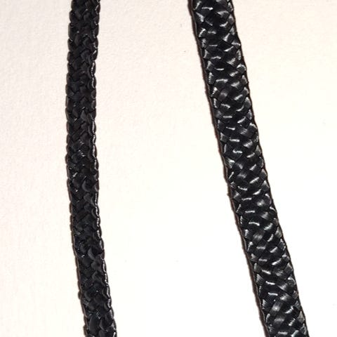 Vintage-koristenauha, kolmiulotteinen käsityönä kokoonommeltu punosrakenne. Nauhamaisen osan materiaali synteettistä (nylon-/asetaattityyppinen) niinimäistä nauhaa. Pitkän palan toisessa päässä valmiiksi muotoiltu hatun päälakiosa, mikä viittaa aiempaan käyttötarkoitukseen hattujen valmistuksessa.