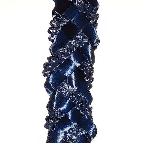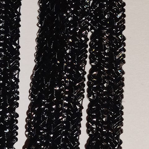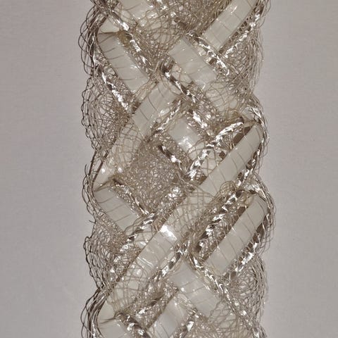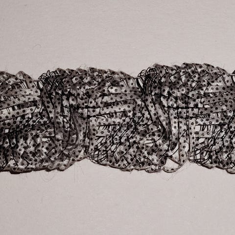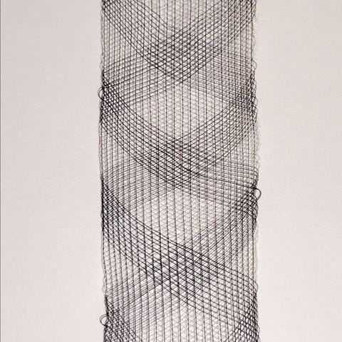 Rakenne: koottu käsin ompelemalla yksittäisistä mustista, niinimäisistä taitepunosrenkaista. Renkaat muodostavat kolmiulotteisen, kukkamaisen pinnan.