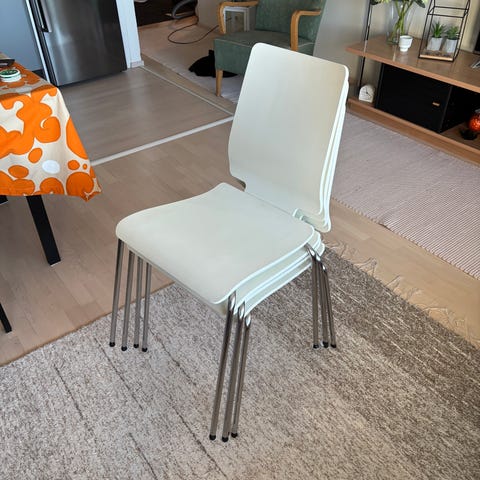 Kolme valkoista ruokapöydän tuolia. Kahdessa tuolissa pientä kulumaa istuin osissa ja yhdessä pikkuruinen reikä joka näkyy kuvassa. Muuten hyvässä kunnossa olevat tuolit!