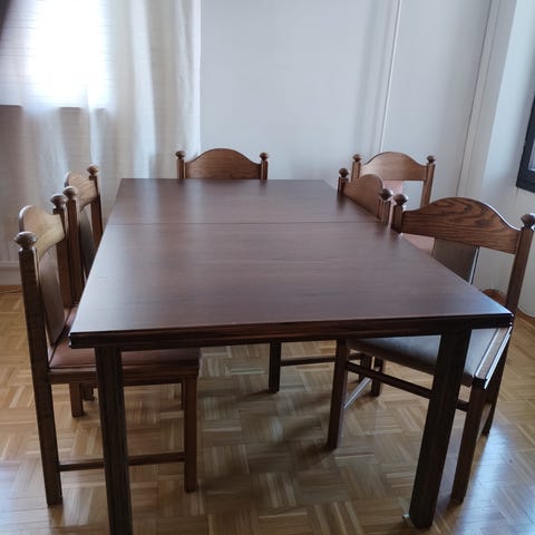 Siisti ja hyväkuntoinen kokopuinen 6 hengen ruokailuryhmä myytävänä. Sisältää kuljetuksen Rovaniemen alueella 20km säteellä.