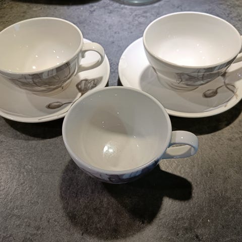 Erittäin hyväkuntoiset Pentik Eden kahvikuppi, aluslautanen ja pullalautanen.