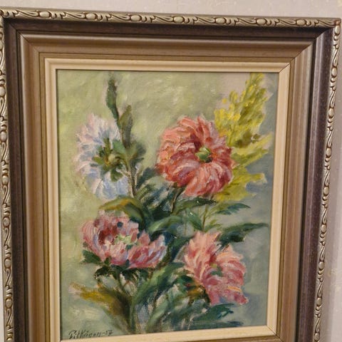 Hakusanat: akvarelli, teos, kehykset, raami, asetelma, öljyväri, Paketoitava, taide, kukkamaalaus, taiteilija, kukka-asetelma, taulu, 1957, taulut, rauha tiihonen, kehys, raamit, väri, sisustus, maisema, vesiväri
