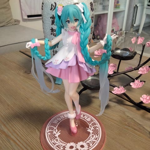 Hatsune Miku -figuuri. Istuvassa asennossa, sopii esimerkiksi hyllyn reunalle. Kunto erinomainen. Korkeus n. 13cm. Nouto Tuirasta tai postitus. Hinta 20e + mahd. postikulut.