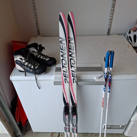 sukset jossa perinteisen maastohiihdon SNS-siteet ja sauvat on 130cm.mukaan saa halutessaan jalasksen monot kokoa 38.väriltään valkoiset punaisella ja sinisillä yksityiskohdilla.on käytön jälkiä.haku ja käteismaksu