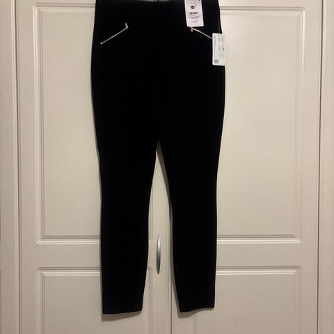 50% polyesteri ja 50% viskoosia. Vyötäröllä nappi ja vetoketjut. Sivuissa taskut.