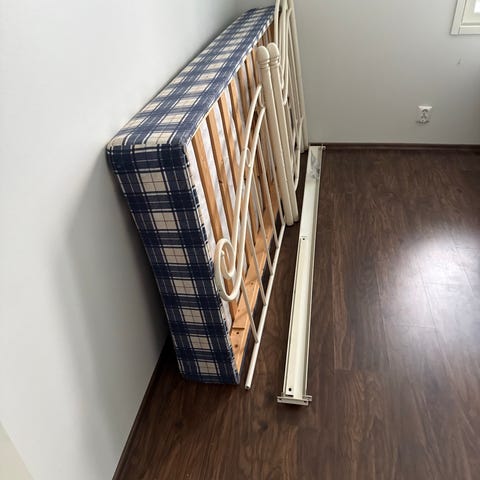 IKEA sänky sinisellä ruudullisella verhoilulla. Kuvissa näkyy joustinpatja ja erillinen päällinen, jotka muodostavat kokonaisuuden. Sängyssä on puiset jalat ja se on tarkoitettu yhdelle nukkujalle. Soveltuu esimerkiksi makuuhuoneeseen tai vierashuoneeseen yksittäiseksi vuoteeksi.