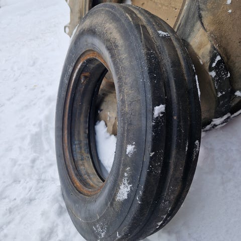 Iäkäs mutta ok-kuntoinen, 11 - 28 -kokoinen traktorin rengas. Käynee myös 12.4 - 28 -kokoisen renkaan pariksi. Sisärengas mukaan, sen kunnosta ei ole tietoa, oletettavasti pitää ilmaa.