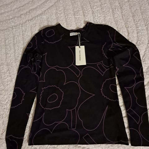 Marimekko kauluspaita naisille, koko 44. Violetti sävy. Materiaali 100 % puuvillaa. Paidassa on lyhyet hihat, kaulus ja nappikiinnitys edessä. Helmassa sivuilla pyöristetyt halkiot. Pituus niskasta helmaan 70cm. Kai-kai leveys 67cm