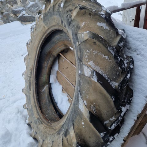 Iäkäs mutta ok-kuntoinen traktorin rengas, koko 6 - 16. Sisärengas mukaan, minkä kunnosta ei tietoa, oletettavasti pitää ilmaa.