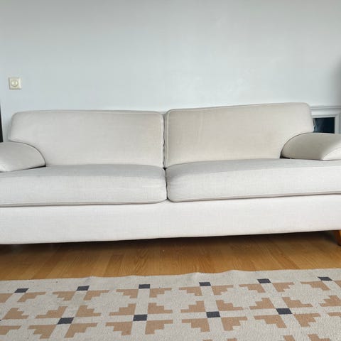 Beige kolmen istuttava sohva irrotettavilla tyynyillä