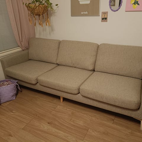 Beige kolmen istuttava sohva (Askon mallisto), jossa on kolme vesipestävää istuintyynyä ja kolme irrotettavaa selkätyynyä. Sohvassa on pehmeä, vaaleasävyinen kangasverhoilu ja pyöristetyt käsinojat. Mukana on kaksi erillistä koristetyynyä. Sopii olohuoneeseen tai oleskelutilaan istuma- ja lepotilaksi useammalle henkilölle. Nouto Vantaalta.