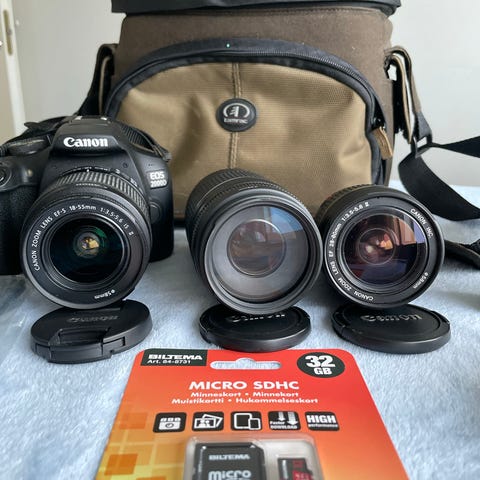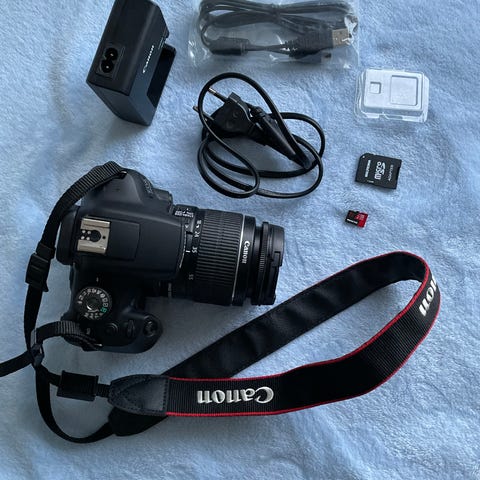 Myynnissä vähäisessä käytössä ollut Canon EOS 2000D sekä kameran mukana tullut Canon EF-S 18-55 mm f/3.5-5.6 III Zoom-objektiivi.