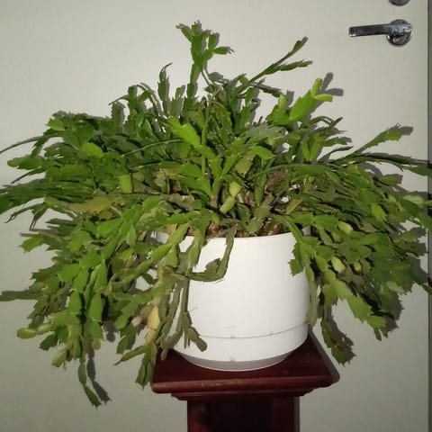 Tilanpuutteen vuoksi vanha, iso ja elinvoimainen, hennon vaaleanpunaisia kukkia tekevä kaktus. Kukki runsaasti joulukuun alussa.