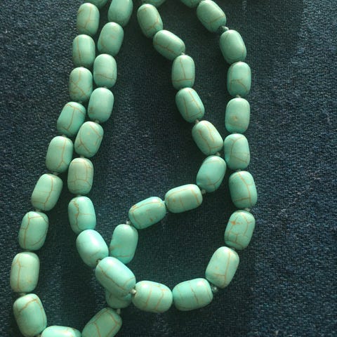Kaulakoru kivihelmistä, hematiitti ja turkoosi, pituus n. 47 cm. Uudenveroinen.