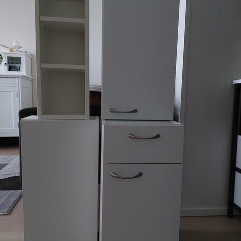 Kalusteryhmä vaikka pesuhuoneeseen tai kodinhoitohuoneeseen. Kolme erillistä kaappia joiden leveydet, 60cm, 40cm, 80cm.